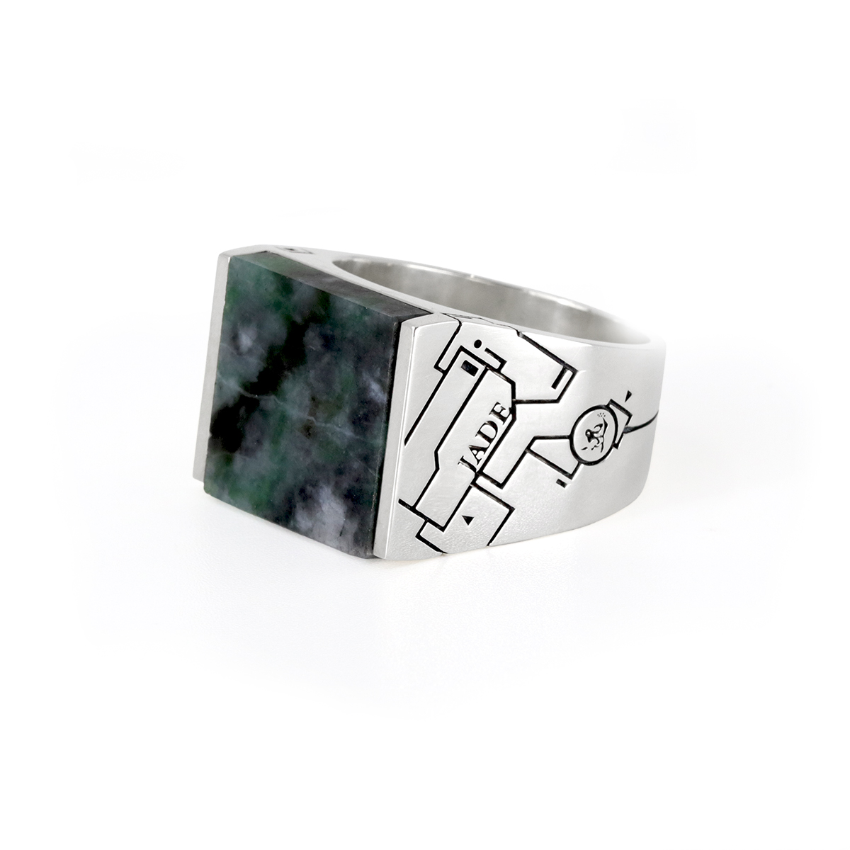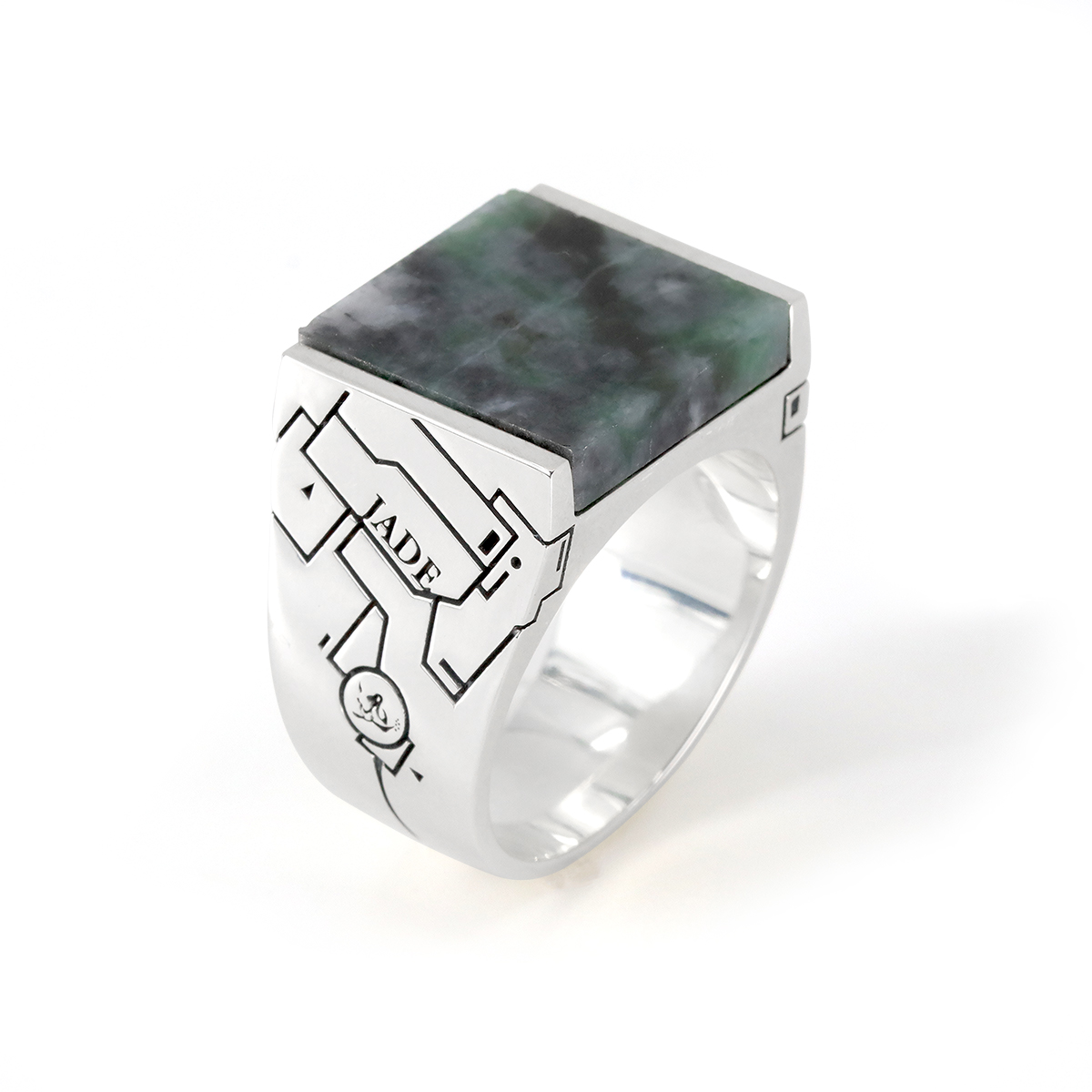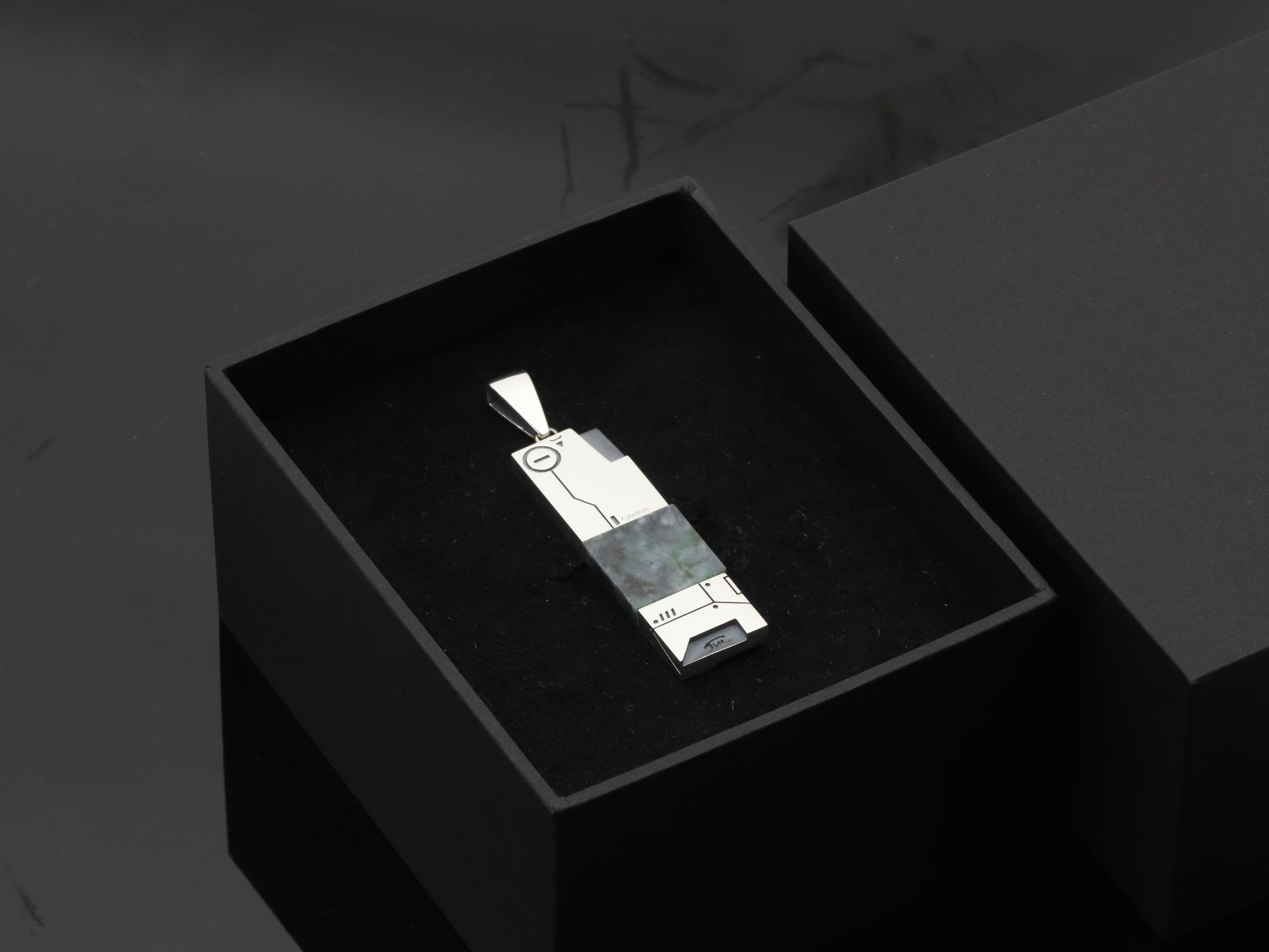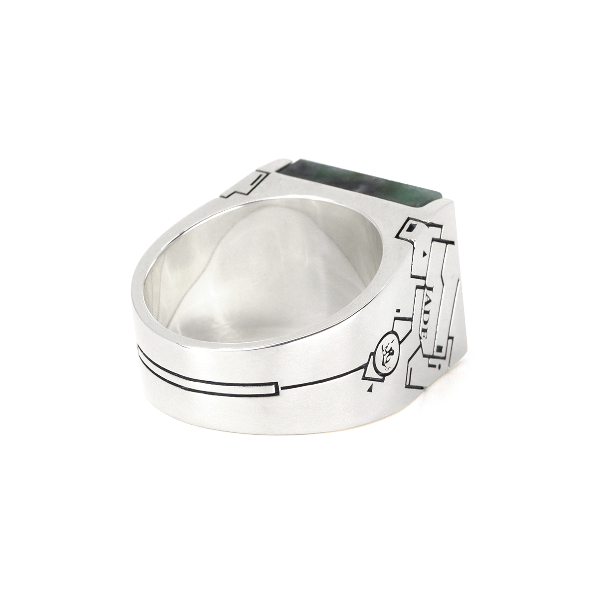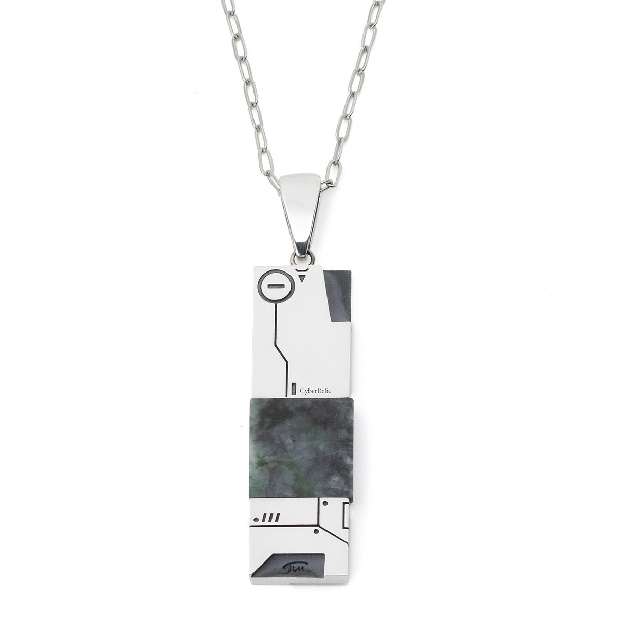 冷たい輝きを放つSLIVER925のボディには、回路を思わせる精密なラインが刻まれ、そこに流れるのは、人が手で刻んだ電子の詩。中央に嵌め込まれた翡翠(JADE)は、古代より”魂の護り石”として日本に伝わる聖なる鉱石。 -