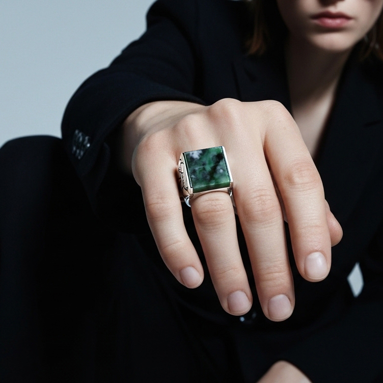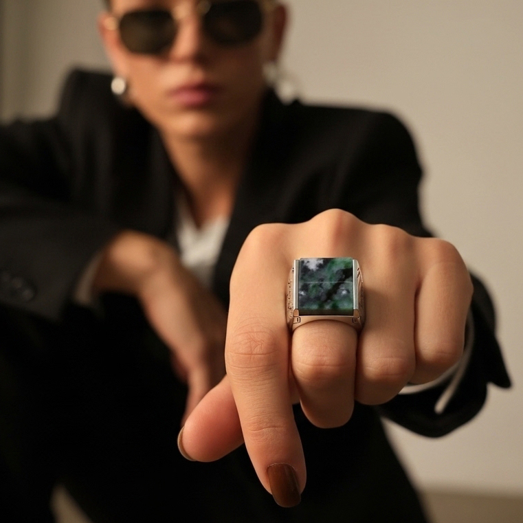 静かに脈打つ緑の光が、銀の器に未来の影を落とす。古代の息づかいと現代の意匠が交差する一点。シルバー925のフレームには、精緻な線が彫り込まれ、冷たさの奥に微かな温度を宿す。